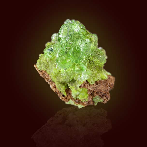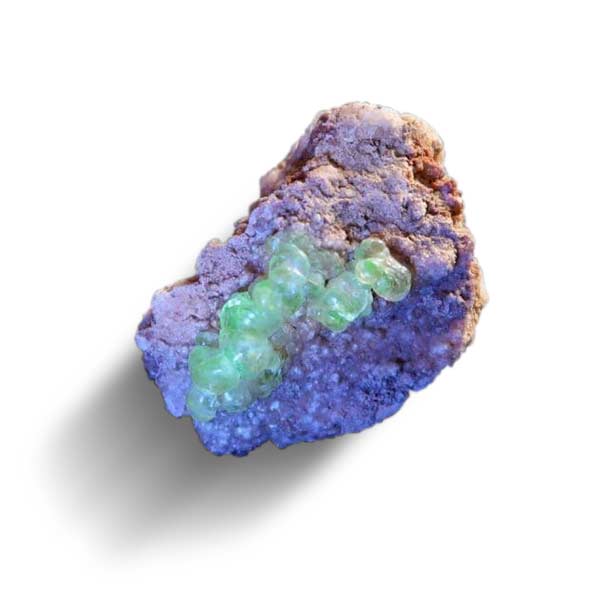 - El aspecto es siempre vítreo y botrioidal (burbujas raciformes traslúcidas) sobre roca volcánica.