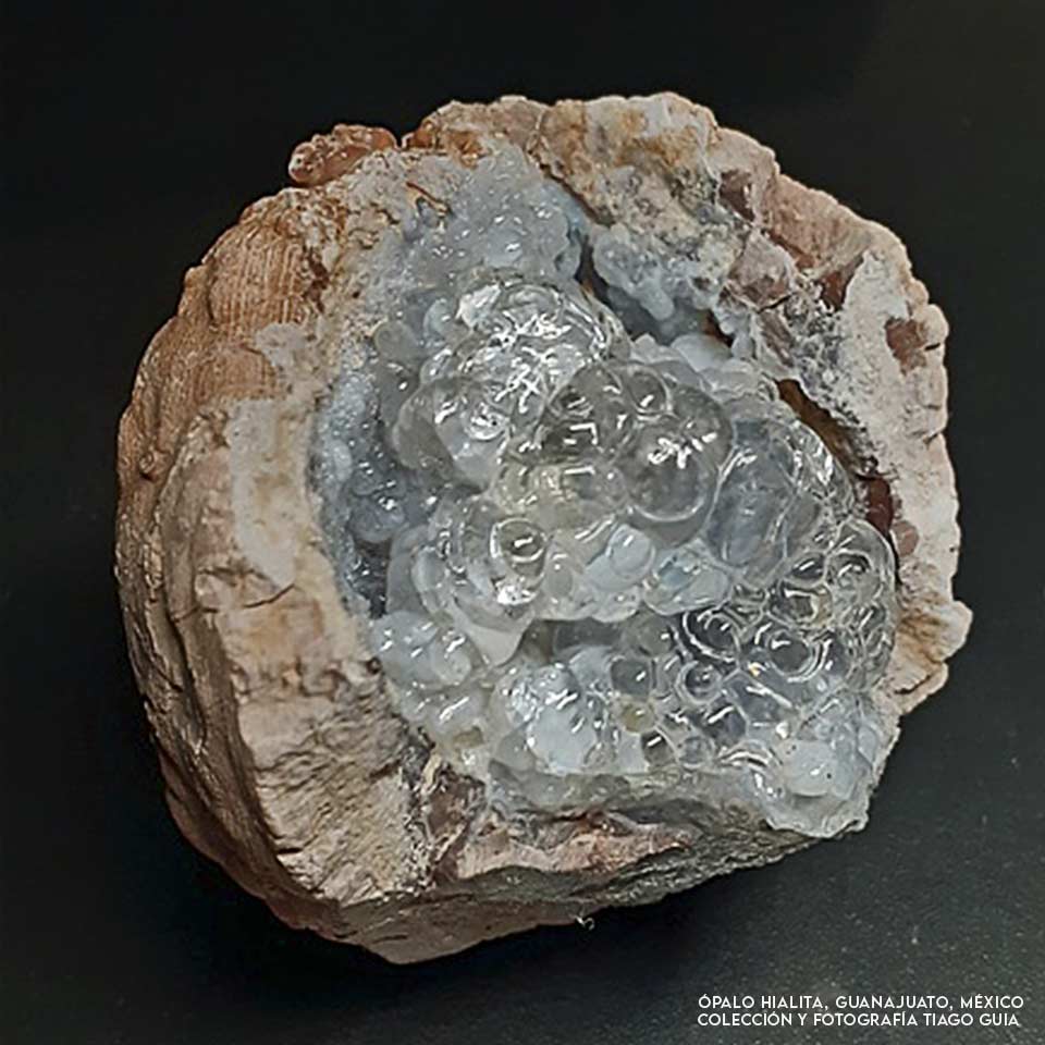 Los especímenes de San Felipe, Guanajuato se presentan en un formato distinto al de Zacatecas: en lugar de recubrimientos sobre toba plana, aquí el ópalo hialita rellena el interior de geodas nodulares riolíticas, formando masas botrioidales de sílice traslúcida con estructura similar a burbujas, frecuentemente asociadas a pequeños cristales de cuarzo.